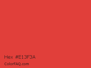 Hex #e13f3a Color is a normal red color and the nearest color is Cinnabar #e34234. Hex code #e13f3a and RGB value is rgb(225,63,58). In RGB color space, this color is composed of 88% red, 25% green, 23% blue, In CMYK color space, this color is composed of 0% cyan, 72% magenta, 74% yellow , 12% black , In HSL color space, this color has a hue angle of 2° , 74% saturation and 55% lightness.