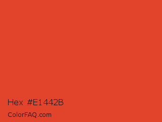 Hex #e1442b Color is a normal red color and the nearest color is Cinnabar #e34234. Hex code #e1442b and RGB value is rgb(225,68,43). In RGB color space, this color is composed of 88% red, 27% green, 17% blue, In CMYK color space, this color is composed of 0% cyan, 70% magenta, 81% yellow , 12% black , In HSL color space, this color has a hue angle of 8° , 75% saturation and 53% lightness.