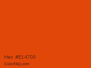 Hex #e14709 Color is a normal orange color and the nearest color is Trinidad #e64e03. Hex code #e14709 and RGB value is rgb(225,71,9). In RGB color space, this color is composed of 88% red, 28% green, 4% blue, In CMYK color space, this color is composed of 0% cyan, 68% magenta, 96% yellow , 12% black , In HSL color space, this color has a hue angle of 17° , 92% saturation and 46% lightness.