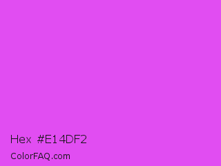 Hex #e14df2 Color is a light magenta color and the nearest color is Purple Pizzazz #fe4eda. Hex code #e14df2 and RGB value is rgb(225,77,242). In RGB color space, this color is composed of 88% red, 30% green, 95% blue, In CMYK color space, this color is composed of 7% cyan, 68% magenta, 0% yellow , 5% black , In HSL color space, this color has a hue angle of 294° , 86% saturation and 63% lightness.
