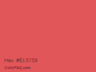 Hex #e15759 Color is a light red color and the nearest color is Mandy #e25465. Hex code #e15759 and RGB value is rgb(225,87,89). In RGB color space, this color is composed of 88% red, 34% green, 35% blue, In CMYK color space, this color is composed of 0% cyan, 61% magenta, 60% yellow , 12% black , In HSL color space, this color has a hue angle of 359° , 70% saturation and 61% lightness.