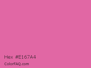 Hex #e167a4 Color is a light rose color and the nearest color is Thulian Pink #de6fa1. Hex code #e167a4 and RGB value is rgb(225,103,164). In RGB color space, this color is composed of 88% red, 40% green, 64% blue, In CMYK color space, this color is composed of 0% cyan, 54% magenta, 27% yellow , 12% black , In HSL color space, this color has a hue angle of 330° , 67% saturation and 64% lightness.