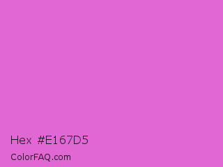 Hex #e167d5 Color is a light magenta color and the nearest color is Orchid #da70d6. Hex code #e167d5 and RGB value is rgb(225,103,213). In RGB color space, this color is composed of 88% red, 40% green, 84% blue, In CMYK color space, this color is composed of 0% cyan, 54% magenta, 5% yellow , 12% black , In HSL color space, this color has a hue angle of 306° , 67% saturation and 64% lightness.