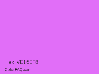 Hex #e16ef8 Color is a light purple color and the nearest color is Heliotrope #df73ff. Hex code #e16ef8 and RGB value is rgb(225,110,248). In RGB color space, this color is composed of 88% red, 43% green, 97% blue, In CMYK color space, this color is composed of 9% cyan, 56% magenta, 0% yellow , 3% black , In HSL color space, this color has a hue angle of 290° , 91% saturation and 70% lightness.