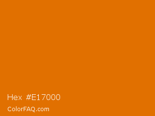 Hex #e17000 Color is a normal orange color and the nearest color is Mango Tango Crayola #e77200. Hex code #e17000 and RGB value is rgb(225,112,0). In RGB color space, this color is composed of 88% red, 44% green, 0% blue, In CMYK color space, this color is composed of 0% cyan, 50% magenta, 100% yellow , 12% black , In HSL color space, this color has a hue angle of 30° , 100% saturation and 44% lightness.