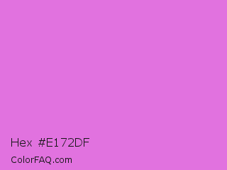 Hex #e172df Color is a light magenta color and the nearest color is Orchid #da70d6. Hex code #e172df and RGB value is rgb(225,114,223). In RGB color space, this color is composed of 88% red, 45% green, 87% blue, In CMYK color space, this color is composed of 0% cyan, 49% magenta, 1% yellow , 12% black , In HSL color space, this color has a hue angle of 301° , 65% saturation and 66% lightness.