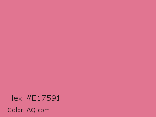 Hex #e17591 Color is a light rose color and the nearest color is Bright Blush #e47698. Hex code #e17591 and RGB value is rgb(225,117,145). In RGB color space, this color is composed of 88% red, 46% green, 57% blue, In CMYK color space, this color is composed of 0% cyan, 48% magenta, 36% yellow , 12% black , In HSL color space, this color has a hue angle of 344° , 64% saturation and 67% lightness.