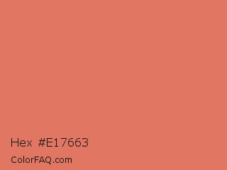 Hex #e17663 Color is a light red color and the nearest color is Terracotta #e2725b. Hex code #e17663 and RGB value is rgb(225,118,99). In RGB color space, this color is composed of 88% red, 46% green, 39% blue, In CMYK color space, this color is composed of 0% cyan, 48% magenta, 56% yellow , 12% black , In HSL color space, this color has a hue angle of 9° , 68% saturation and 64% lightness.