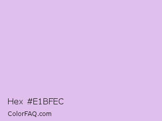 Hex #e1bfec Color is a very light purple color and the nearest color is French Lilac #ecc7ee. Hex code #e1bfec and RGB value is rgb(225,191,236). In RGB color space, this color is composed of 88% red, 75% green, 93% blue, In CMYK color space, this color is composed of 5% cyan, 19% magenta, 0% yellow , 7% black , In HSL color space, this color has a hue angle of 285° , 54% saturation and 84% lightness.
