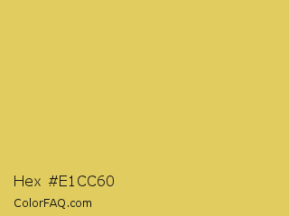 Hex #e1cc60 Color is a light yellow color and the nearest color is Tacha #d6c562. Hex code #e1cc60 and RGB value is rgb(225,204,96). In RGB color space, this color is composed of 88% red, 80% green, 38% blue, In CMYK color space, this color is composed of 0% cyan, 9% magenta, 57% yellow , 12% black , In HSL color space, this color has a hue angle of 50° , 68% saturation and 63% lightness.