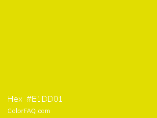 Hex #e1dd01 Color is a normal yellow color and the nearest color is Peridot #e6e200. Hex code #e1dd01 and RGB value is rgb(225,221,1). In RGB color space, this color is composed of 88% red, 87% green, 0% blue, In CMYK color space, this color is composed of 0% cyan, 2% magenta, 100% yellow , 12% black , In HSL color space, this color has a hue angle of 59° , 99% saturation and 44% lightness.