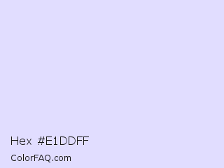 Hex #e1ddff Color is a very light indigo color and the nearest color is Lavender Mist #e6e6fa. Hex code #e1ddff and RGB value is rgb(225,221,255). In RGB color space, this color is composed of 88% red, 87% green, 100% blue, In CMYK color space, this color is composed of 12% cyan, 13% magenta, 0% yellow , 0% black , In HSL color space, this color has a hue angle of 247° , 100% saturation and 93% lightness.