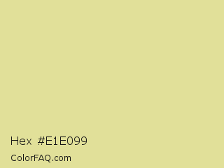 Hex #e1e099 Color is a light yellow color and the nearest color is Zombie #e4d69b. Hex code #e1e099 and RGB value is rgb(225,224,153). In RGB color space, this color is composed of 88% red, 88% green, 60% blue, In CMYK color space, this color is composed of 0% cyan, 0% magenta, 32% yellow , 12% black , In HSL color space, this color has a hue angle of 59° , 55% saturation and 74% lightness.