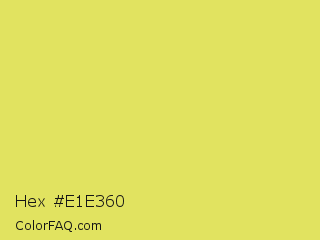 Hex #e1e360 Color is a light yellow color and the nearest color is Booger Buster #dde26a. Hex code #e1e360 and RGB value is rgb(225,227,96). In RGB color space, this color is composed of 88% red, 89% green, 38% blue, In CMYK color space, this color is composed of 1% cyan, 0% magenta, 58% yellow , 11% black , In HSL color space, this color has a hue angle of 61° , 70% saturation and 63% lightness.