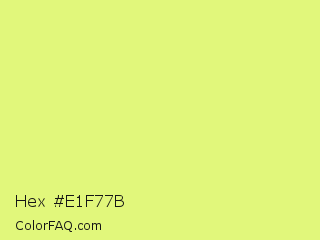 Hex #e1f77b Color is a light lime color and the nearest color is Mindaro #e3f988. Hex code #e1f77b and RGB value is rgb(225,247,123). In RGB color space, this color is composed of 88% red, 97% green, 48% blue, In CMYK color space, this color is composed of 9% cyan, 0% magenta, 50% yellow , 3% black , In HSL color space, this color has a hue angle of 71° , 89% saturation and 73% lightness.
