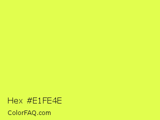 Hex #e1fe4e Color is a light yellow color and the nearest color is Starship #ecf245. Hex code #e1fe4e and RGB value is rgb(225,254,78). In RGB color space, this color is composed of 88% red, 100% green, 31% blue, In CMYK color space, this color is composed of 11% cyan, 0% magenta, 69% yellow , 0% black , In HSL color space, this color has a hue angle of 70° , 99% saturation and 65% lightness.