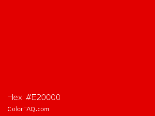 Hex #e20000 Color is a normal red color and the nearest color is Rosso Corsa #d40000. Hex code #e20000 and RGB value is rgb(226,0,0). In RGB color space, this color is composed of 89% red, 0% green, 0% blue, In CMYK color space, this color is composed of 0% cyan, 100% magenta, 100% yellow , 11% black , In HSL color space, this color has a hue angle of 0° , 100% saturation and 44% lightness.
