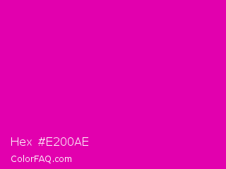 Hex #e200ae Color is a normal magenta color and the nearest color is Hollywood Cerise #f400a1. Hex code #e200ae and RGB value is rgb(226,0,174). In RGB color space, this color is composed of 89% red, 0% green, 68% blue, In CMYK color space, this color is composed of 0% cyan, 100% magenta, 23% yellow , 11% black , In HSL color space, this color has a hue angle of 314° , 100% saturation and 44% lightness.