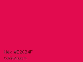 Hex #e20b4f Color is a normal rose color and the nearest color is Debian Red #d70a53. Hex code #e20b4f and RGB value is rgb(226,11,79). In RGB color space, this color is composed of 89% red, 4% green, 31% blue, In CMYK color space, this color is composed of 0% cyan, 95% magenta, 65% yellow , 11% black , In HSL color space, this color has a hue angle of 341° , 91% saturation and 46% lightness.