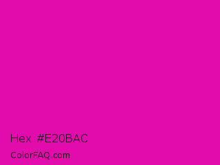 Hex #e20bac Color is a normal magenta color and the nearest color is Hollywood Cerise #f400a1. Hex code #e20bac and RGB value is rgb(226,11,172). In RGB color space, this color is composed of 89% red, 4% green, 67% blue, In CMYK color space, this color is composed of 0% cyan, 95% magenta, 24% yellow , 11% black , In HSL color space, this color has a hue angle of 315° , 91% saturation and 46% lightness.