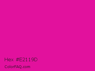 Hex #e2119d Color is a normal magenta color and the nearest color is Barbie Pink #e0218a. Hex code #e2119d and RGB value is rgb(226,17,157). In RGB color space, this color is composed of 89% red, 7% green, 62% blue, In CMYK color space, this color is composed of 0% cyan, 92% magenta, 31% yellow , 11% black , In HSL color space, this color has a hue angle of 320° , 86% saturation and 48% lightness.