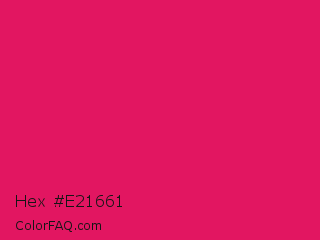 Hex #e21661 Color is a normal rose color and the nearest color is Ruby #e0115f. Hex code #e21661 and RGB value is rgb(226,22,97). In RGB color space, this color is composed of 89% red, 9% green, 38% blue, In CMYK color space, this color is composed of 0% cyan, 90% magenta, 57% yellow , 11% black , In HSL color space, this color has a hue angle of 338° , 82% saturation and 49% lightness.