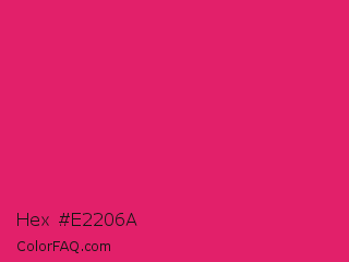 Hex #e2206a Color is a normal rose color and the nearest color is Razzmatazz #e3256b. Hex code #e2206a and RGB value is rgb(226,32,106). In RGB color space, this color is composed of 89% red, 13% green, 42% blue, In CMYK color space, this color is composed of 0% cyan, 86% magenta, 53% yellow , 11% black , In HSL color space, this color has a hue angle of 337° , 77% saturation and 51% lightness.
