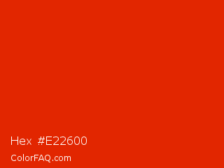 Hex #e22600 Color is a normal red color and the nearest color is Ferrari Red #ff2800. Hex code #e22600 and RGB value is rgb(226,38,0). In RGB color space, this color is composed of 89% red, 15% green, 0% blue, In CMYK color space, this color is composed of 0% cyan, 83% magenta, 100% yellow , 11% black , In HSL color space, this color has a hue angle of 10° , 100% saturation and 44% lightness.