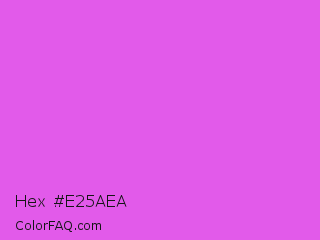 Hex #e25aea Color is a light magenta color and the nearest color is Orchid #da70d6. Hex code #e25aea and RGB value is rgb(226,90,234). In RGB color space, this color is composed of 89% red, 35% green, 92% blue, In CMYK color space, this color is composed of 3% cyan, 62% magenta, 0% yellow , 8% black , In HSL color space, this color has a hue angle of 297° , 77% saturation and 64% lightness.