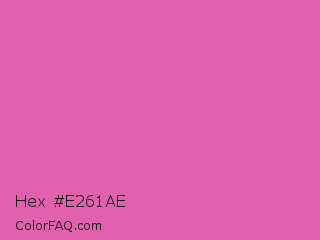 Hex #e261ae Color is a light magenta color and the nearest color is Thulian Pink #de6fa1. Hex code #e261ae and RGB value is rgb(226,97,174). In RGB color space, this color is composed of 89% red, 38% green, 68% blue, In CMYK color space, this color is composed of 0% cyan, 57% magenta, 23% yellow , 11% black , In HSL color space, this color has a hue angle of 324° , 69% saturation and 63% lightness.