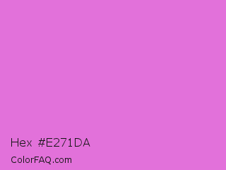 Hex #e271da Color is a light magenta color and the nearest color is Orchid #da70d6. Hex code #e271da and RGB value is rgb(226,113,218). In RGB color space, this color is composed of 89% red, 44% green, 85% blue, In CMYK color space, this color is composed of 0% cyan, 50% magenta, 4% yellow , 11% black , In HSL color space, this color has a hue angle of 304° , 66% saturation and 66% lightness.