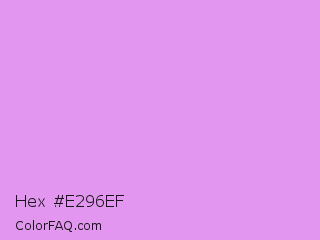 Hex #e296ef Color is a light purple color and the nearest color is Bright Lilac #d891ef. Hex code #e296ef and RGB value is rgb(226,150,239). In RGB color space, this color is composed of 89% red, 59% green, 94% blue, In CMYK color space, this color is composed of 5% cyan, 37% magenta, 0% yellow , 6% black , In HSL color space, this color has a hue angle of 291° , 74% saturation and 76% lightness.