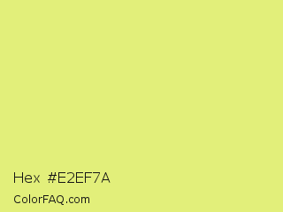 Hex #e2ef7a Color is a light yellow color and the nearest color is Manz #eeef78. Hex code #e2ef7a and RGB value is rgb(226,239,122). In RGB color space, this color is composed of 89% red, 94% green, 48% blue, In CMYK color space, this color is composed of 5% cyan, 0% magenta, 49% yellow , 6% black , In HSL color space, this color has a hue angle of 67° , 79% saturation and 71% lightness.