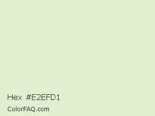 Hex #e2efd1 Color is a very light green color and the nearest color is Kidnapper #e1ead4. Hex code #e2efd1 and RGB value is rgb(226,239,209). In RGB color space, this color is composed of 89% red, 94% green, 82% blue, In CMYK color space, this color is composed of 5% cyan, 0% magenta, 13% yellow , 6% black , In HSL color space, this color has a hue angle of 86° , 48% saturation and 88% lightness.