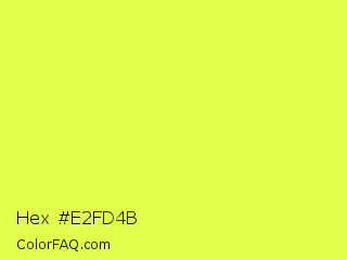 Hex #e2fd4b Color is a light yellow color and the nearest color is Starship #ecf245. Hex code #e2fd4b and RGB value is rgb(226,253,75). In RGB color space, this color is composed of 89% red, 99% green, 29% blue, In CMYK color space, this color is composed of 11% cyan, 0% magenta, 70% yellow , 1% black , In HSL color space, this color has a hue angle of 69° , 98% saturation and 64% lightness.
