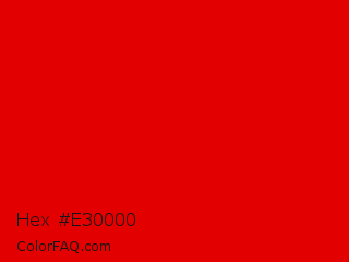 Hex #e30000 Color is a normal red color and the nearest color is KU Crimson #e8000d. Hex code #e30000 and RGB value is rgb(227,0,0). In RGB color space, this color is composed of 89% red, 0% green, 0% blue, In CMYK color space, this color is composed of 0% cyan, 100% magenta, 100% yellow , 11% black , In HSL color space, this color has a hue angle of 0° , 100% saturation and 45% lightness.