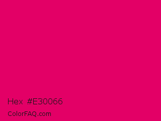 Hex #e30066 Color is a normal rose color and the nearest color is Raspberry #e30b5d. Hex code #e30066 and RGB value is rgb(227,0,102). In RGB color space, this color is composed of 89% red, 0% green, 40% blue, In CMYK color space, this color is composed of 0% cyan, 100% magenta, 55% yellow , 11% black , In HSL color space, this color has a hue angle of 333° , 100% saturation and 45% lightness.