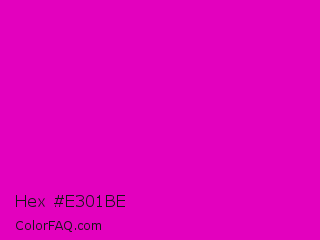 Hex #e301be Color is a normal magenta color and the nearest color is Deep Magenta #cc00cc. Hex code #e301be and RGB value is rgb(227,1,190). In RGB color space, this color is composed of 89% red, 0% green, 75% blue, In CMYK color space, this color is composed of 0% cyan, 100% magenta, 16% yellow , 11% black , In HSL color space, this color has a hue angle of 310° , 99% saturation and 45% lightness.