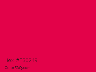 Hex #e30249 Color is a normal rose color and the nearest color is UA Red #d9004c. Hex code #e30249 and RGB value is rgb(227,2,73). In RGB color space, this color is composed of 89% red, 1% green, 29% blue, In CMYK color space, this color is composed of 0% cyan, 99% magenta, 68% yellow , 11% black , In HSL color space, this color has a hue angle of 341° , 98% saturation and 45% lightness.