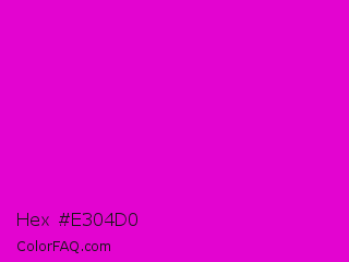 Hex #e304d0 Color is a normal magenta color and the nearest color is Deep Magenta #cc00cc. Hex code #e304d0 and RGB value is rgb(227,4,208). In RGB color space, this color is composed of 89% red, 2% green, 82% blue, In CMYK color space, this color is composed of 0% cyan, 98% magenta, 8% yellow , 11% black , In HSL color space, this color has a hue angle of 305° , 97% saturation and 45% lightness.