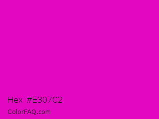 Hex #e307c2 Color is a normal magenta color and the nearest color is Deep Magenta #cc00cc. Hex code #e307c2 and RGB value is rgb(227,7,194). In RGB color space, this color is composed of 89% red, 3% green, 76% blue, In CMYK color space, this color is composed of 0% cyan, 97% magenta, 15% yellow , 11% black , In HSL color space, this color has a hue angle of 309° , 94% saturation and 46% lightness.