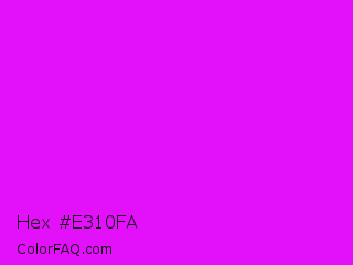 Hex #e310fa Color is a normal magenta color and the nearest color is Phlox #df00ff. Hex code #e310fa and RGB value is rgb(227,16,250). In RGB color space, this color is composed of 89% red, 6% green, 98% blue, In CMYK color space, this color is composed of 9% cyan, 94% magenta, 0% yellow , 2% black , In HSL color space, this color has a hue angle of 294° , 96% saturation and 52% lightness.