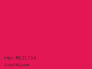 Hex #e31754 Color is a normal rose color and the nearest color is Spanish Crimson #e51a4c. Hex code #e31754 and RGB value is rgb(227,23,84). In RGB color space, this color is composed of 89% red, 9% green, 33% blue, In CMYK color space, this color is composed of 0% cyan, 90% magenta, 63% yellow , 11% black , In HSL color space, this color has a hue angle of 342° , 82% saturation and 49% lightness.