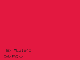 Hex #e31840 Color is a normal red color and the nearest color is Crimson #dc143c. Hex code #e31840 and RGB value is rgb(227,24,64). In RGB color space, this color is composed of 89% red, 9% green, 25% blue, In CMYK color space, this color is composed of 0% cyan, 89% magenta, 72% yellow , 11% black , In HSL color space, this color has a hue angle of 348° , 81% saturation and 49% lightness.