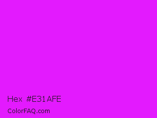 Hex #e31afe Color is a normal magenta color and the nearest color is Phlox #df00ff. Hex code #e31afe and RGB value is rgb(227,26,254). In RGB color space, this color is composed of 89% red, 10% green, 100% blue, In CMYK color space, this color is composed of 11% cyan, 90% magenta, 0% yellow , 0% black , In HSL color space, this color has a hue angle of 293° , 99% saturation and 55% lightness.