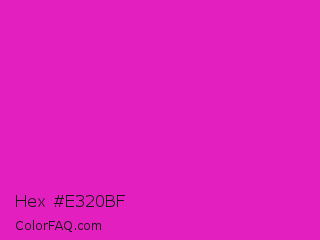 Hex #e320bf Color is a normal magenta color and the nearest color is Shocking Pink #fc0fc0. Hex code #e320bf and RGB value is rgb(227,32,191). In RGB color space, this color is composed of 89% red, 13% green, 75% blue, In CMYK color space, this color is composed of 0% cyan, 86% magenta, 16% yellow , 11% black , In HSL color space, this color has a hue angle of 311° , 78% saturation and 51% lightness.