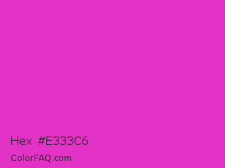 Hex #e333c6 Color is a normal magenta color and the nearest color is Steel Pink #cc33cc. Hex code #e333c6 and RGB value is rgb(227,51,198). In RGB color space, this color is composed of 89% red, 20% green, 78% blue, In CMYK color space, this color is composed of 0% cyan, 78% magenta, 13% yellow , 11% black , In HSL color space, this color has a hue angle of 310° , 76% saturation and 55% lightness.