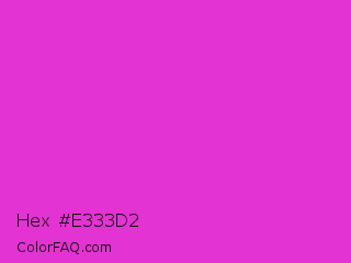 Hex #e333d2 Color is a normal magenta color and the nearest color is Steel Pink #cc33cc. Hex code #e333d2 and RGB value is rgb(227,51,210). In RGB color space, this color is composed of 89% red, 20% green, 82% blue, In CMYK color space, this color is composed of 0% cyan, 78% magenta, 7% yellow , 11% black , In HSL color space, this color has a hue angle of 306° , 76% saturation and 55% lightness.