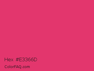 Hex #e3366d Color is a normal rose color and the nearest color is Cerise Red #de3163. Hex code #e3366d and RGB value is rgb(227,54,109). In RGB color space, this color is composed of 89% red, 21% green, 43% blue, In CMYK color space, this color is composed of 0% cyan, 76% magenta, 52% yellow , 11% black , In HSL color space, this color has a hue angle of 341° , 76% saturation and 55% lightness.