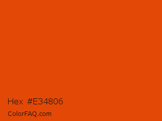 Hex #e34806 Color is a normal orange color and the nearest color is Trinidad #e64e03. Hex code #e34806 and RGB value is rgb(227,72,6). In RGB color space, this color is composed of 89% red, 28% green, 2% blue, In CMYK color space, this color is composed of 0% cyan, 68% magenta, 97% yellow , 11% black , In HSL color space, this color has a hue angle of 18° , 95% saturation and 46% lightness.